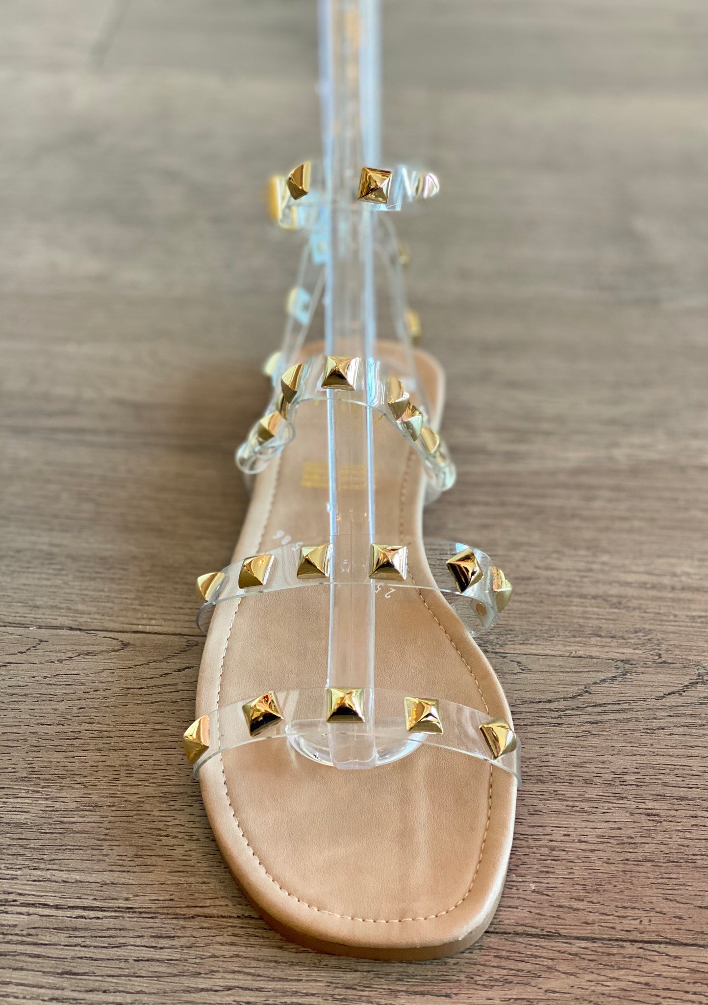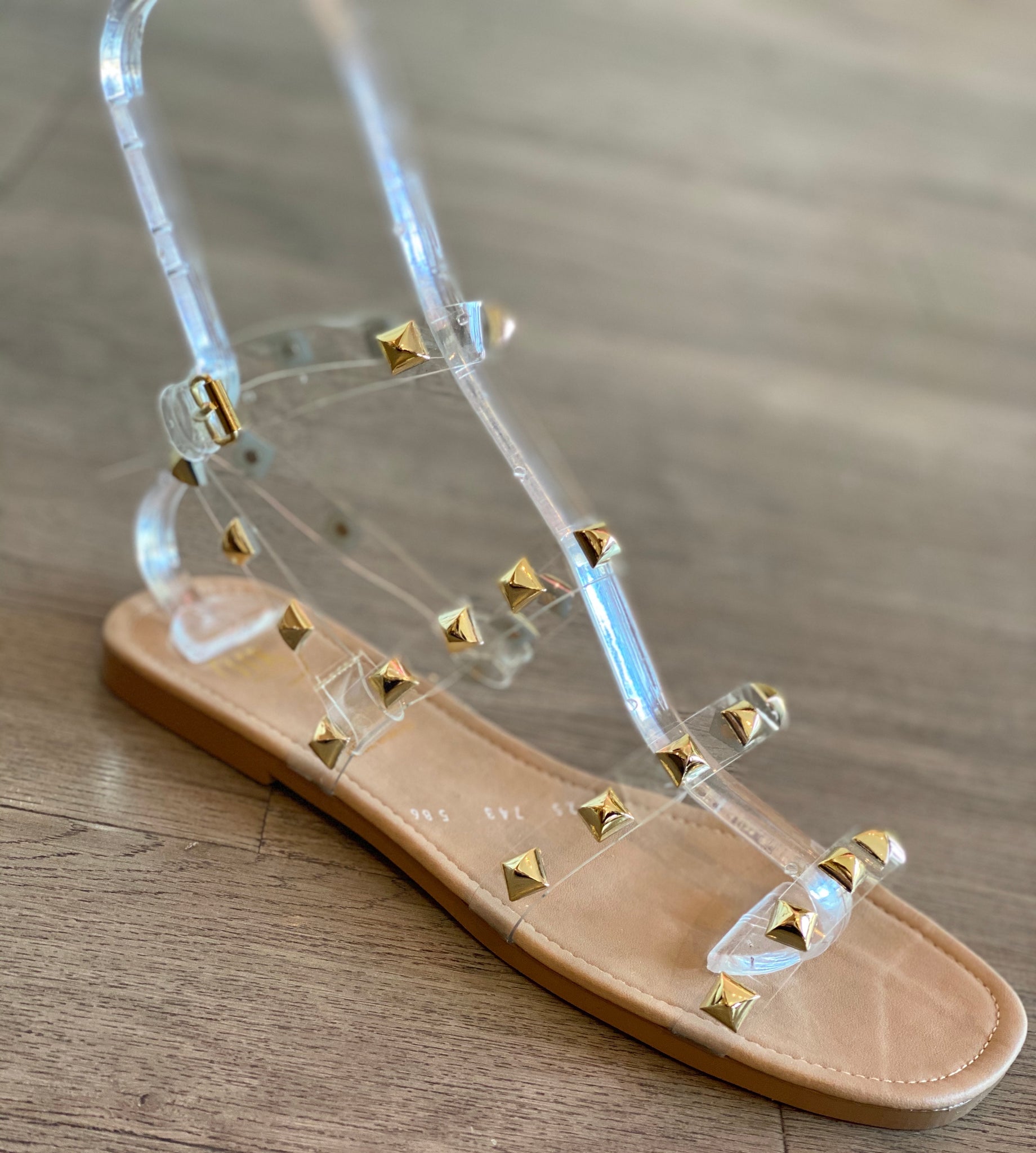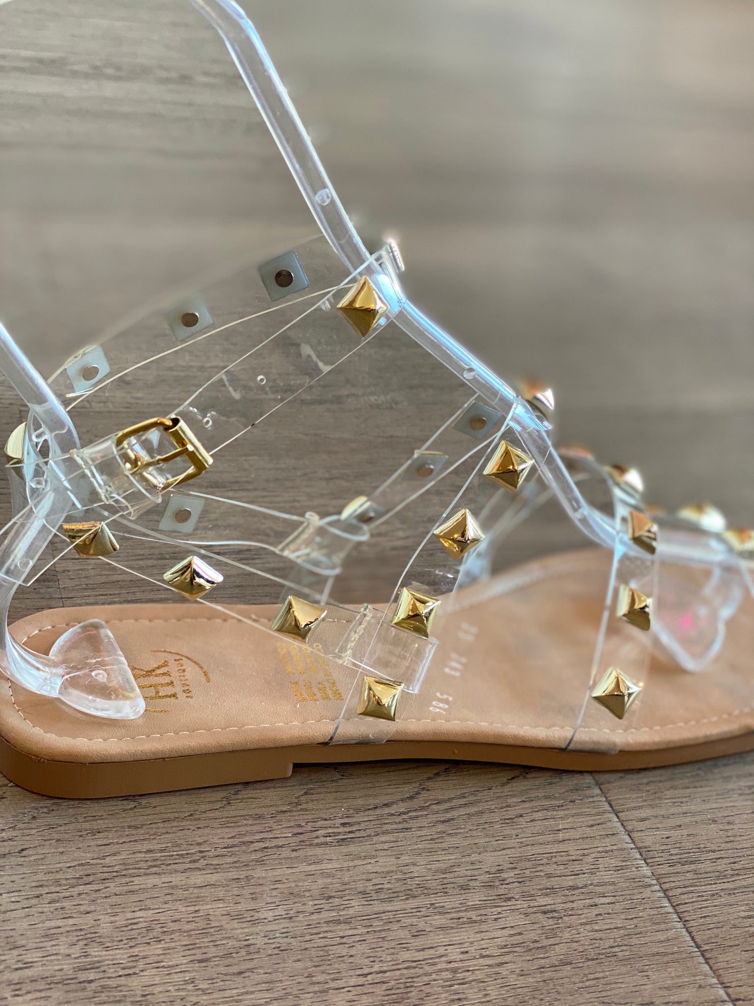 Sandalia De Punta Redonda Con Tiras Transparentes Con Remaches Como Detalle.