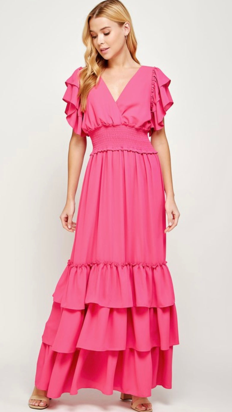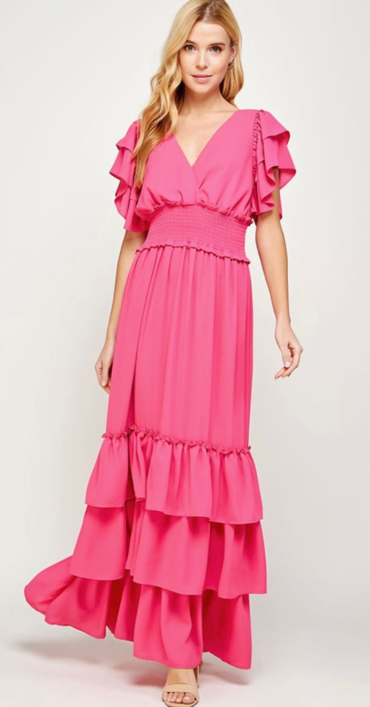 - Vestido Largo Con Olanes Y Elastico Corrugado En El Área De La Cintura, Manga Corta Y Escote En V Cruzado.