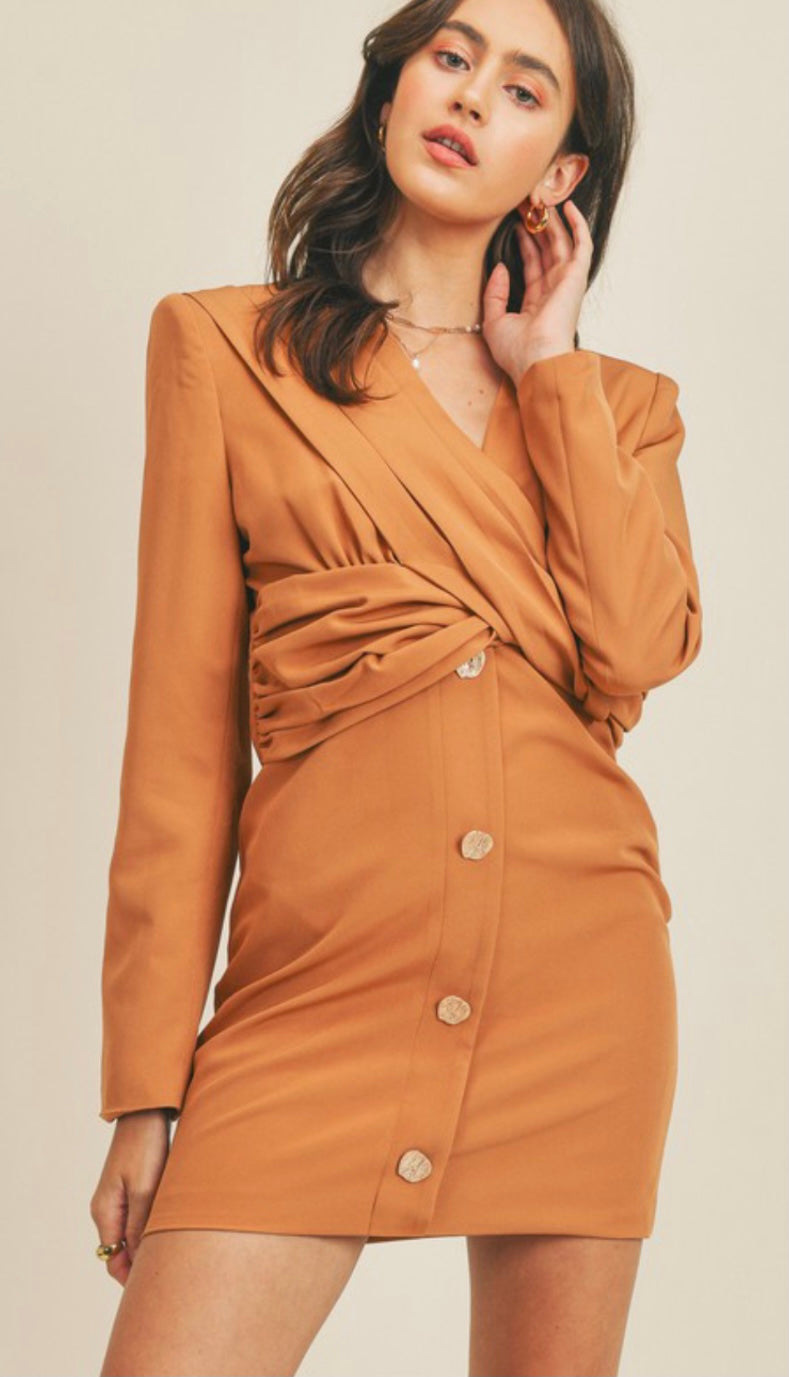 Vestido Corto De Manga Larga Y Cuello V Con Detalle Cruzado Al Frente.